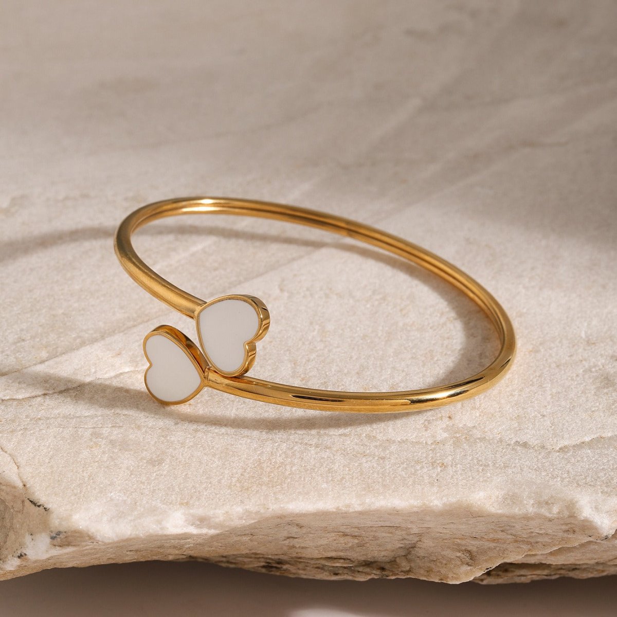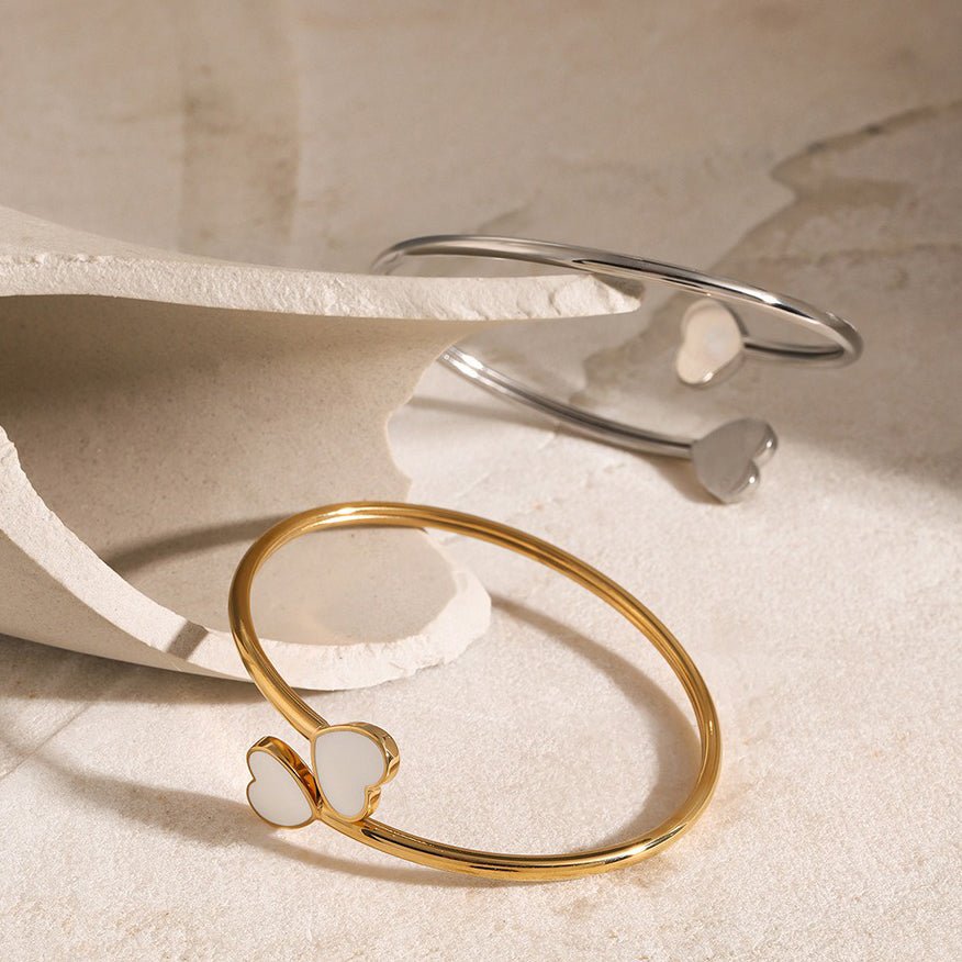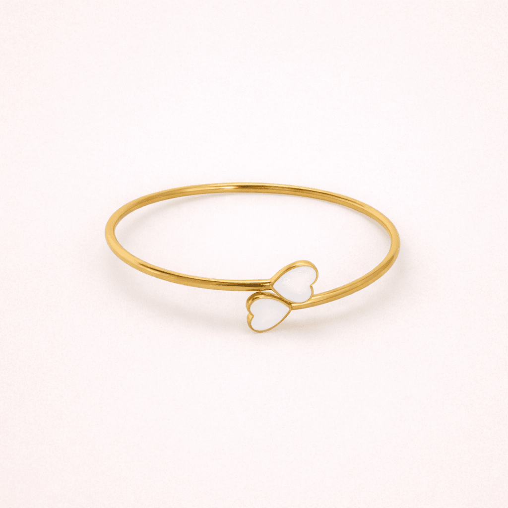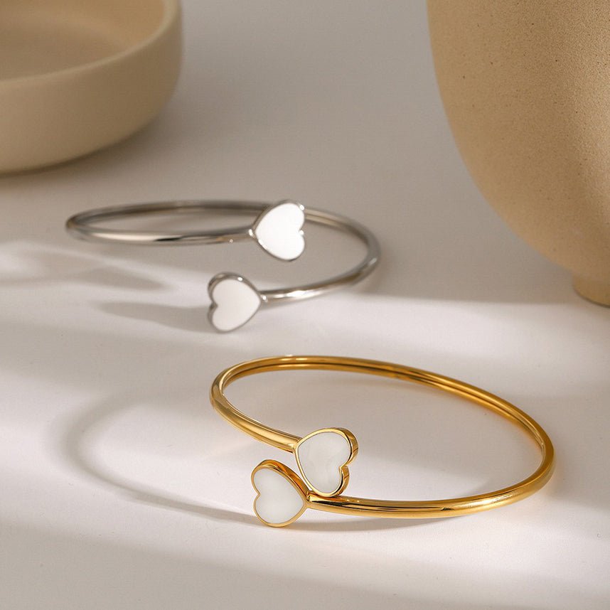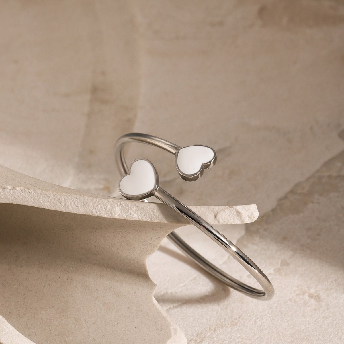 Duo Hearts Bracelet is a romantic open-cuff design featuring two sculptural heart motifs that meet gracefully at the center of the wrist. The clean, modern lines balance softness with structure, creating a piece that feels both playful and refined. Its open silhouette allows for effortless wear while adding a subtle statement that pairs beautifully with everyday styling or layered bracelets.